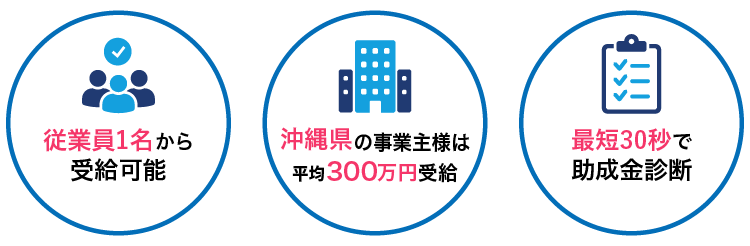 \ 沖縄県内の事業主様向けに特化! / 30秒の無料診断をしてみる 登録は不要です。全助成金・全業種対応しています。 助成金は1名以上の従業員が在籍し、雇用保険に加入する法人・個人事業主が対象で、申請は何度でもできます。しかし、実は 94%の事業主様に申請漏れが生じています。 助成金は1名以上の従業員が在籍し、雇用保険に加入する法人・個人事業主が対象で、申請は何度でもできます。しかし、実は 94%の事業主様に申請漏れが生じています。 その理由の多くは 国や顧問社労士から何も提案されない 審査条件が厳しく申請が却下されそう コロナ関連助成金以外は書類が煩雑 どんな助成金があるのかわからない 助成金は審査なし 助成金は補助金と異なり、審査はありません!雇用保険に加入している従業員が1名でもいれば受給の対象になります。 助成金の財源は雇用保険料 助成金の財源は雇用保険料なので、雇用保険を納めているのに受給していないのは大きな損失です。 個人・法人、 業種は不問 個人事業と中小企業に特化した“沖縄グラントサポート”は、すべての助成金に対応できます。1社あたりの平均受給額は約300万円です! \ 助成金を利用してビジネス拡大しませんか? / 30秒の無料診断をしてみる 申請から受給までフルサポートしますのでご安心ください。 年間30,000社以上の診断実績をもとに、数多くの事業主様から助成金申請をご利用いただきました。 年間30,000社以上の診断実績をもとに、数多くの事業主様から助成金申請をご利用いただきました。 建設業 従業員数:3名 助成金受給額:425万円 歯科医院 従業員数:8名 助成金受給額:1,280万円 製造業 従業員数:15名 助成金受給額:842万円 サービス業 従業員数:43名 助成金受給額:1,485万円 なぜ“沖縄グラントサポート”が選ばれるのか 選ばれる4つの理由が当社にはあります! 理由 01 圧倒的な数の実績 診断実績は年間30,000社、申請サポートは年間6,000件以上!(※)業界トップ水準の実績とノウハウを持っているので、ほぼ丸投げで安心してご利用いただけます。 ※2021年の実績です。 理由 02 最大金額まで受給可能 多種多様な助成金がありますが、“沖縄グラントサポート”は全てに対応できるノウハウを持っています。金額も最大まで受給でき、2021年には最大で2,500万円を受給しました。 理由 03 沖縄県全域対応&無料で利用可能 沖縄本島・宮古島・石垣島など、お住まいの地域を問わず全域対応します。沖縄本島以外の方やお忙しくて時間が取れない方はオンラインでも行っています。さらに、診断は何度でも無料で可能です! 理由 04 診断から受給まですべてお任せ 助成金の受給申請に合わせた就業規則の修正や、助成金申請書類作成など、必要な手続きをすべて行います。診断から受給完了まですべてワンストップで対応しますので、安心してお任せください。 電話でのご相談・お問い合わせは 098-979-8492 受付時間(平日): 10:00~18:00 \ まずはどんな助成金が受給できるか確認! / 30秒の無料診断をしてみる 登録は不要です。最短30秒で診断可能です。